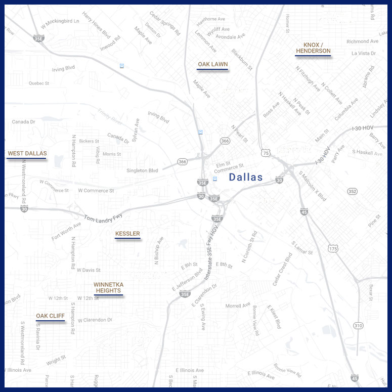Each neighborhood in the area offers something different for your preferred lifestyle. If you are looking for historic homes that have been updated with modern features and technology, check out Winnetka Heights. For a life surrounded by the arts try Kessler or West Dallas. For urban culture wrapped in vibrant growth you'll love Oak Cliff. Knox/Henerson is at the center of new entertainment and contemporary development. Oak Lawn offers upscale condos and a diverse community of urban professionals.